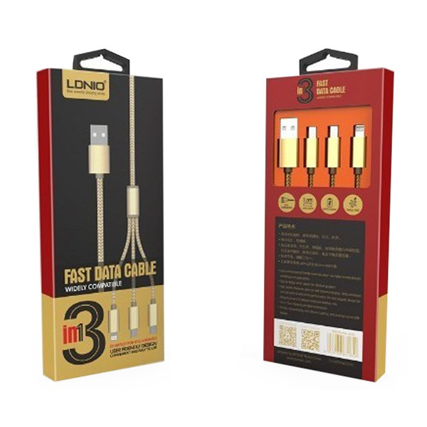 کابل سه سر LDNIO مدل LS85 در حقیقت یک کابل ۳ به ۱ هست که در یک سمت USB در سمت دیگر یک خروجی لایتنینگ و دو خروجی Micro USB قرار دارد. این کابل دارای یک لایه ی اضافه جهت ارتقاء کیفیت و کارایی محصول می باشد.